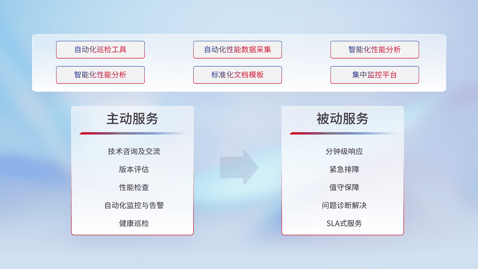 智能化工具和标准化文档,,保障服务质量,,,提供主动服务(包含技术咨询、、、版本评估、、、、性能检查、、、自动化监控与告警、、、、健康巡检)和被动服务包含(分钟级响应、、、、紧急排障、、、、值守保障、、、、问题诊断解决、、SLA服务)。。。。