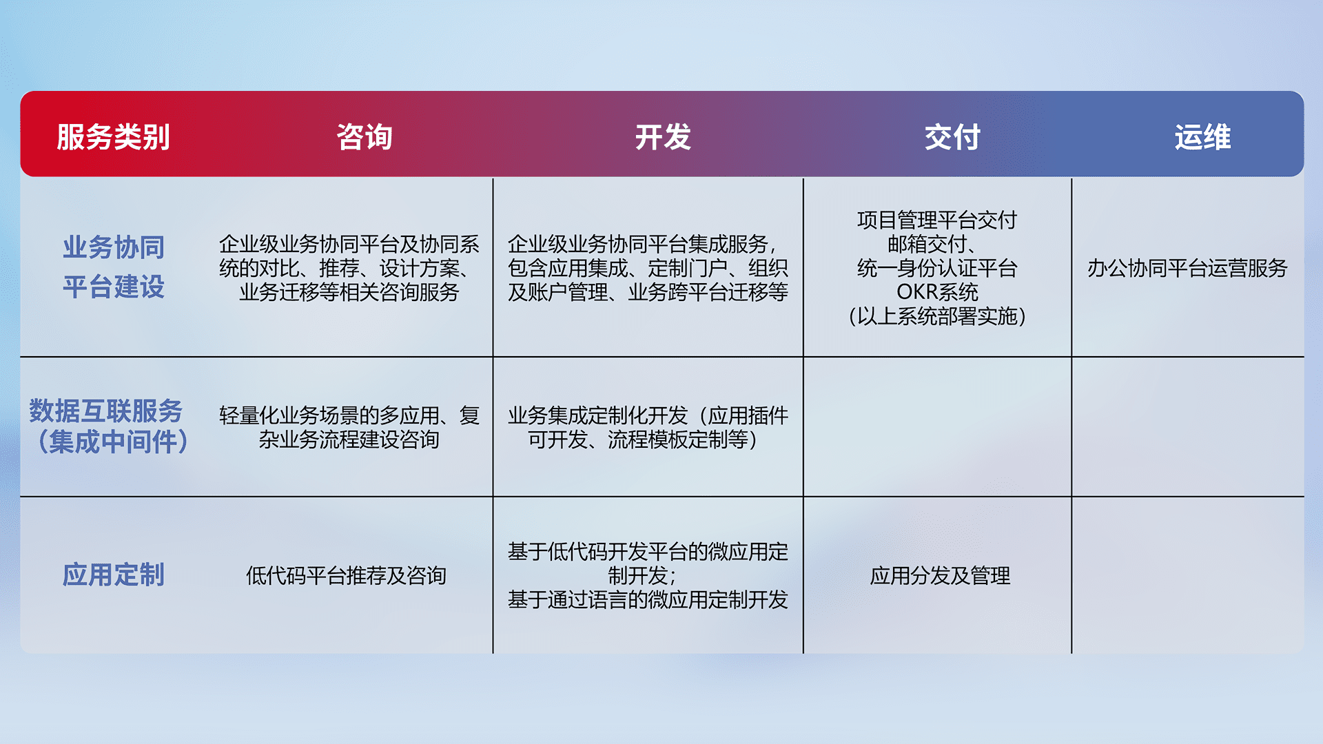 针对钉钉、、企微、、、IDaas等平台级产品提供产品的规划、、、、方案、、、、交付、、、定制化开发等服务,,实现如统一协同办公、、智能客户服务、、混合会议管理、、、智能数据查询、、、、等业务场景,,实现数字化转型。。。